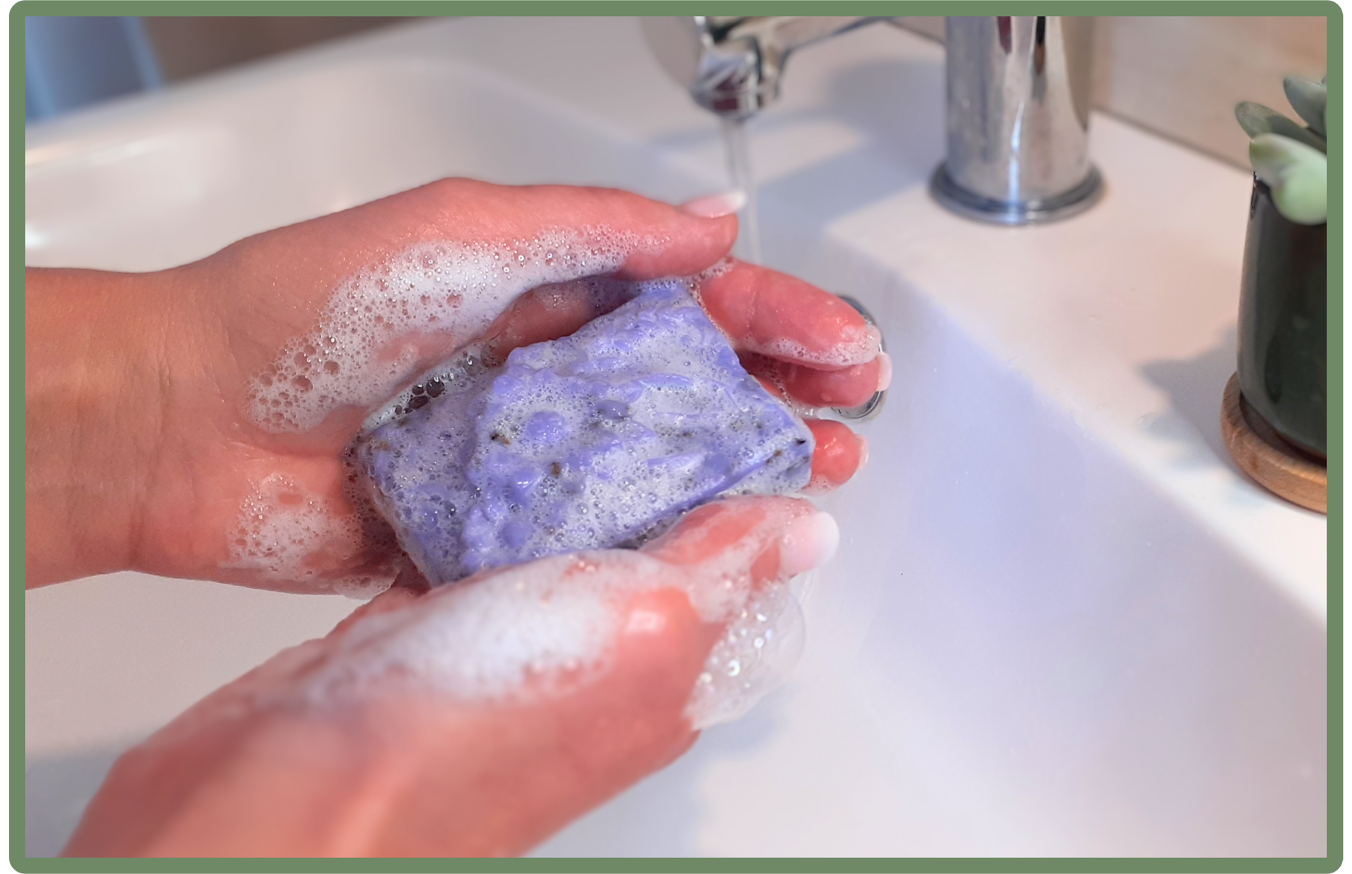 Mouillez votre peau à l'eau tiède puis faire mousser le savon dans vos mains ou sur une éponge Konjac.