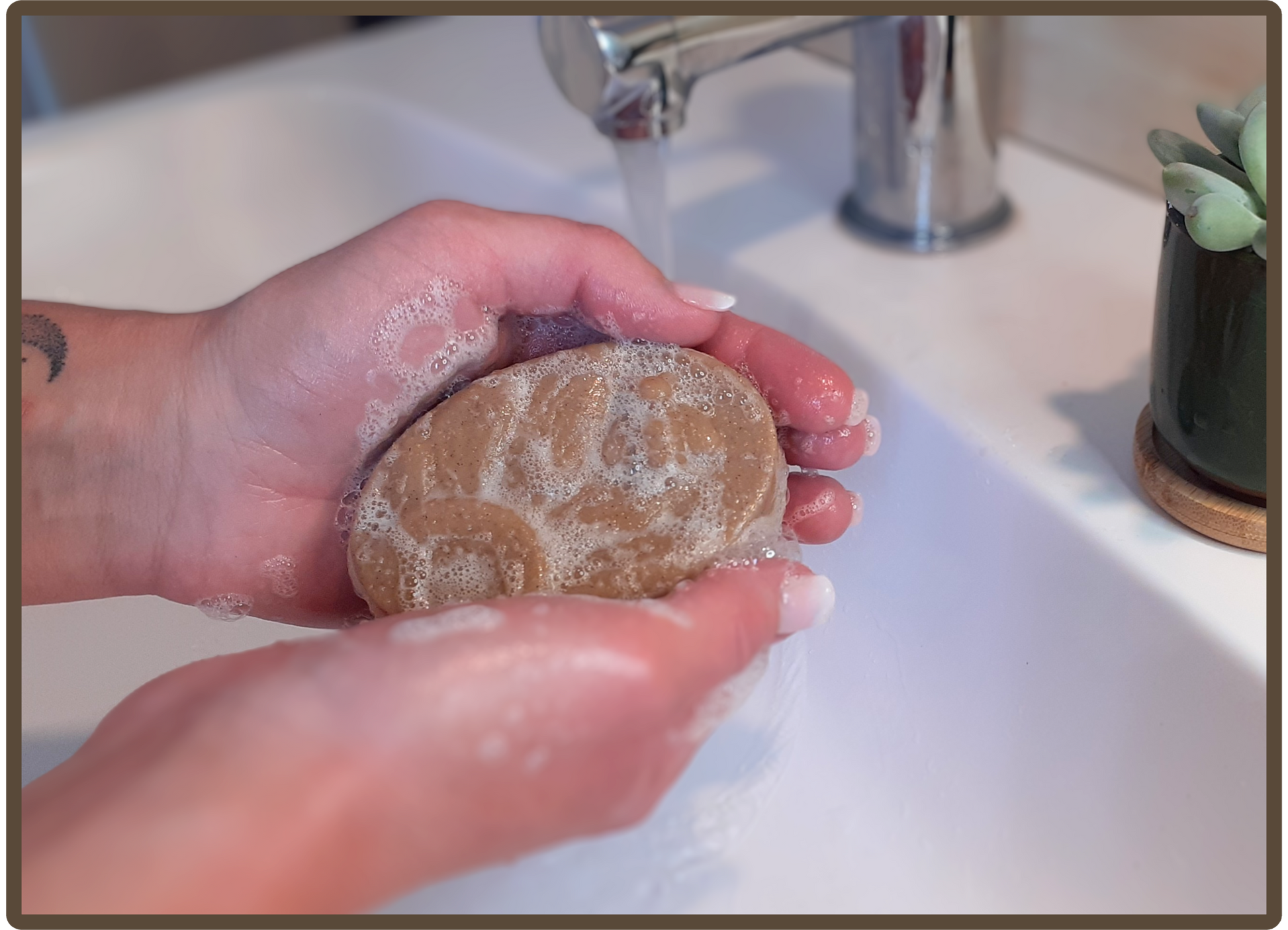 Mouillez votre peau à l’eau tiède puis faire mousser le savon dans vos mains ou sur une éponge Konjac.
